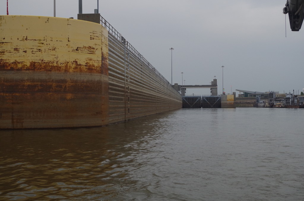 The Mel Price Lock has two chambers . One is 1200 feet long for the big tows. The other is 600 feet for us and small tows. We locked down in the 600 foot lock at the same time a down bound tow locked down in the 1200 foot lock