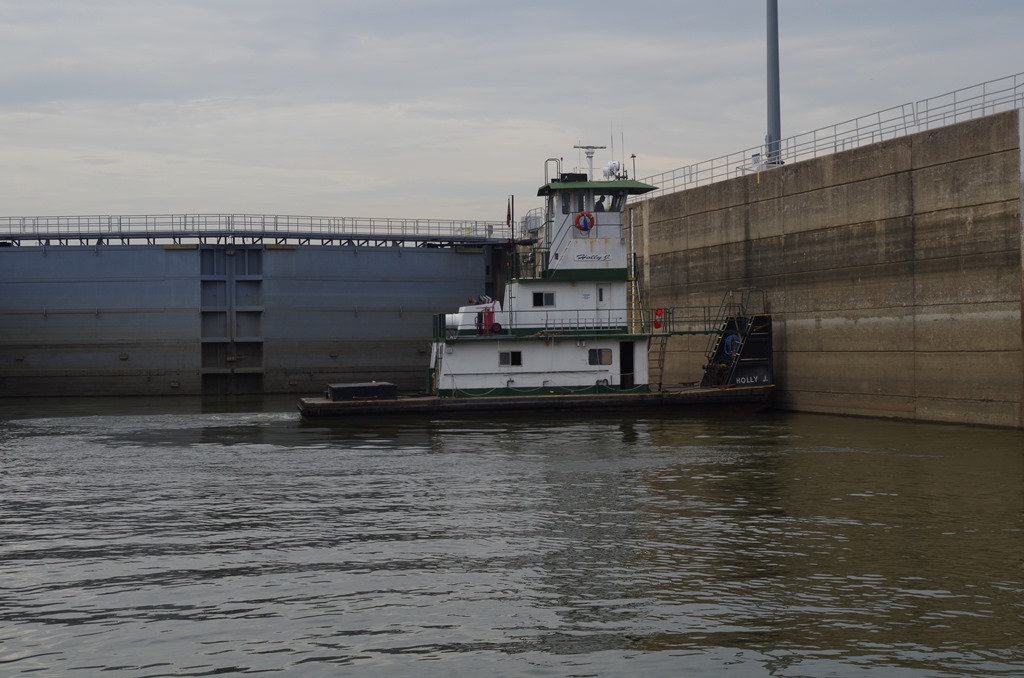We locked through with this tow. Her name is Holly P. The captain didn’t even need to tie off. He just pushed against the lock wall to hold him in place.