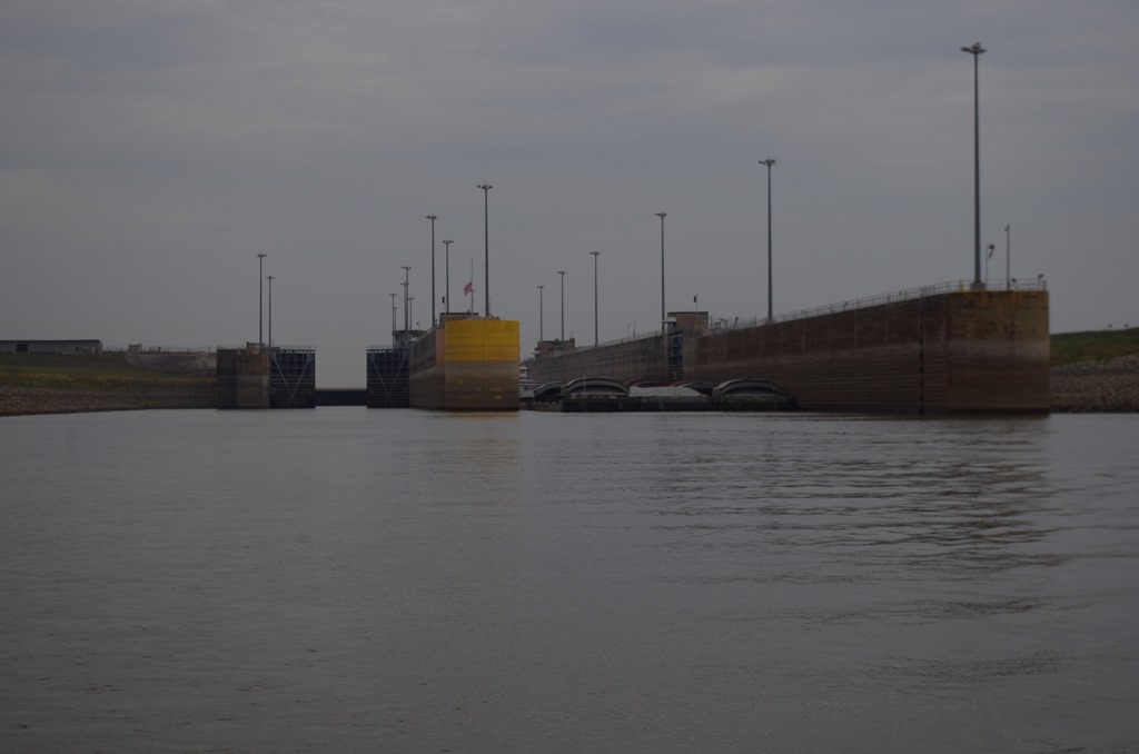 The Chain of Rocks Lock has twin locks. A 1200 footer and a 600 footer. As we came up to the small lock, we could not tell if the doors were open. The light was flashing red so Bryce floated us around for a few seconds. When all of a sudden the lock master told us to enter. He also said there would be a tow joining us for a lift down too. The 600 footer has this unique lock door that raises up by huge chains rather than doors on hinges.
