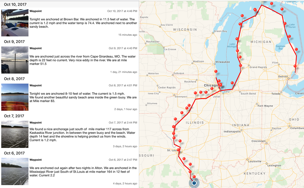 After we are safely anchored or in a marina somewhere, I click on to Trackmytour and log our position. I add a photo of where we are and put in info like last night: Tonight we anchored at what is called Brown’s Bar at Mile Marker 25. We anchored in 11.5 feet of water. The current is 1.2 mph and the water temp is 74.4. We anchored next to a sandy beach. Bryce will also write a review and post it on Active Captain for other boaters to see.