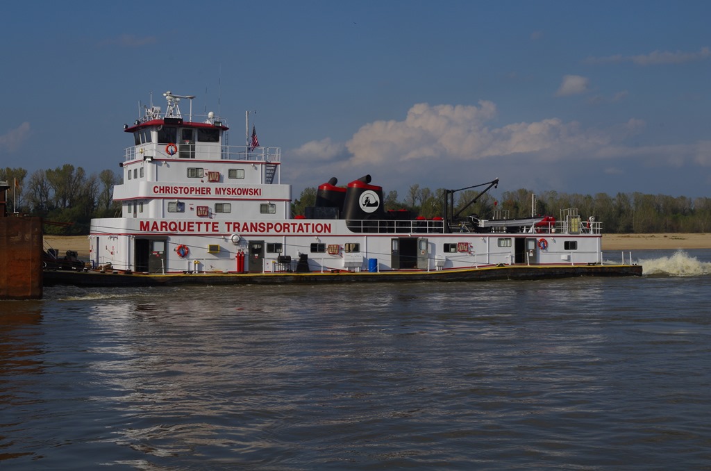 Christopher was pushing 4 rows by 7 barges long. That comes out to 28 barges. So one barge equals about 70 Semi trucks. This means this 28 barge comes out to 1,960 Semi trucks… Here is another fun fact: One loaded covered hopper barge carries 58,333 bushels of wheat, enough to make about 2.5 million loaves of bread. I love bread ![]()