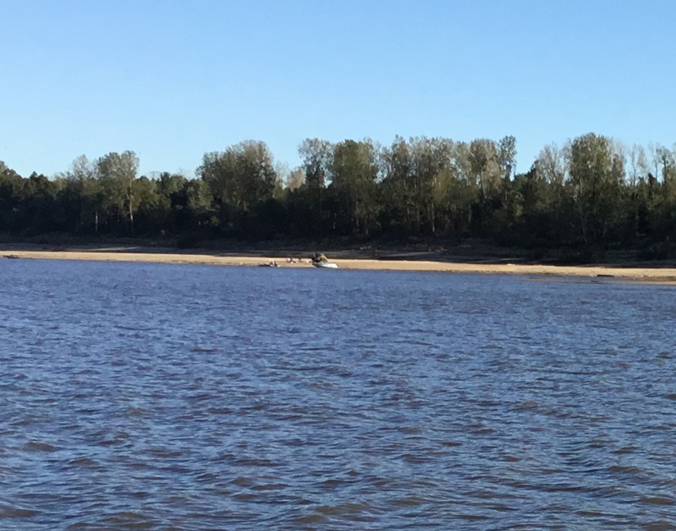 This is the nice sandy Kentucky shoreline. These sandy beaches are one of the things we love about the river. We are anchored at Mile Marker 890 just across from the New Madrid. We are on the inside curve of the river, inside the red buoys. An inside curve of the river is our favorite place to anchor as it is most often a sandy shore with little current. In spite of the current being 3-5 mph in the center of the river, on the inside curves the current drops to 0.5 mph. The water temp is cooling down at 64.9 degrees. Brrrr You really can’t see it too well, but there is a tiny fishing boat with a tent up on the beach. Sure hope they stayed warm last night.