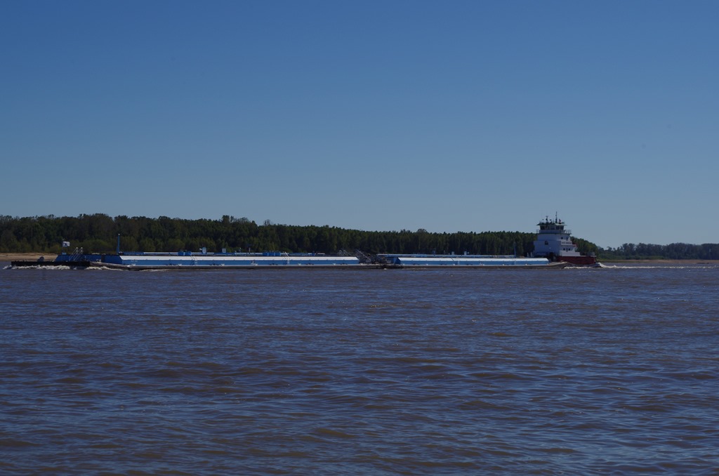 Look how long this tow is. Her name is Angela K. She was pushing 4 wide and 7 long barges. Total 28 barges. The longest we saw today was 8 barges long by 4 wide. This would be about 1700 feet long. Do you know how much cargo is moved on the Mississippi? 620 million tons moved on the inland waterways system in 1995, 321 million tons moved on the Mississippi River. The Ohio River tonnage 236 million while the Gulf Intracoastal Waterway saw 119 million ton.