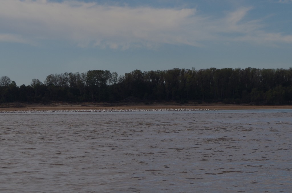 See all the white birds on shore? They are all Geese or swans (hard to tell with Binoculars) perhaps migrating.