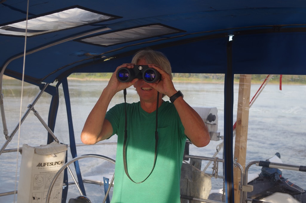 Bryce looking ahead to see what side he will be passing the tow on. Binoculars are quite useful; particularly at night where their large objective lenses gather more light than our eyes.