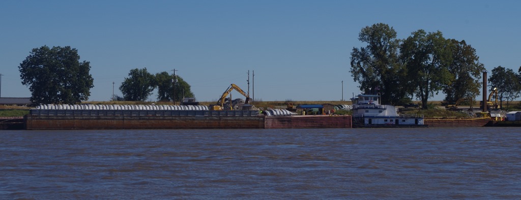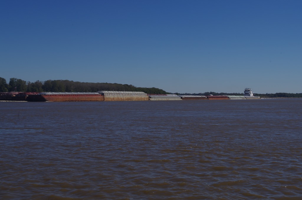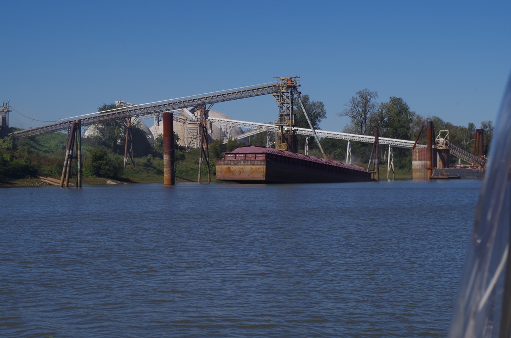 I thought this was an interesting setup. The trucks bring the farmer’s harvest directly to a grate on the road where they dump the grain down onto conveyers that immediately place the grain into the barge. There is no intervening silo or storage facility. Amazing to see how many barges go up and down the Mississippi.
