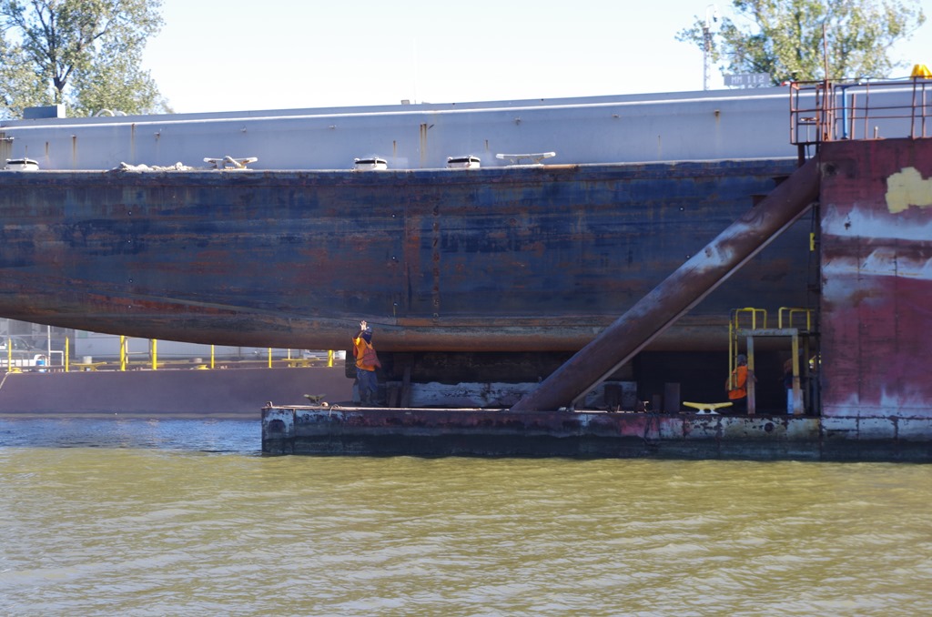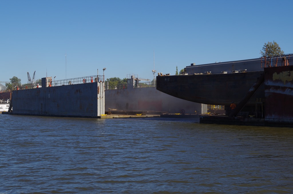 Here a dry dock with a barge in it. I was waving to the workers who are saying hello.