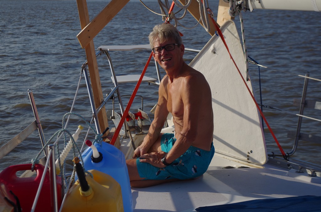 It was a warm day. Bryce is happy setting the anchor. And as usual, when it gets this warm, he is in a swim suit.