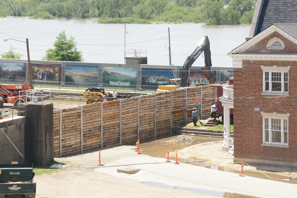 To protect the down-town district, these huge wood walls seal off the normal openings in the levee. For this particular opening, the street is dug up. Unfortunately, some structures, such as the train museum are outside the levee.