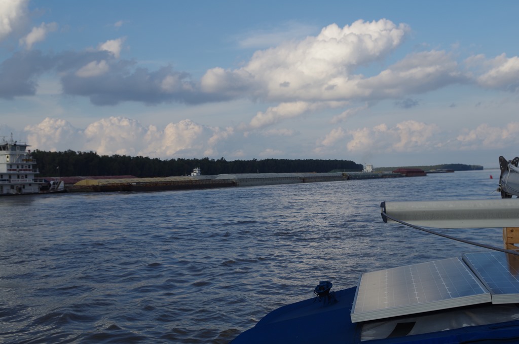 This is totally crazy… We were coming around a bend.  There were three tows on this bend at the same time!!  We passed three tows at at the same time!  We were hugging the inside red buoys while they went further out.  It was like an expressway of tows and barges. LOL On the lower half of the River it is so wide that it really isn’t a big deal. Ok I can say that now… This picture shows the three tows and the red buoy we just came around.