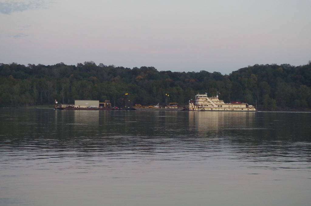 As we were pulling into our anchorage for the night, we watched this Army Crop of Engineering boat go by. Its name again is called the Mississippi.  We have seen this guy a few times on the river.  A smaller tow is on the port side (this side) of the Mississippi.