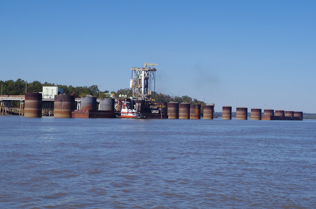 We passed by this area with a huge number of “cells”. Cells are these large steel rock/concreate filled caissons. Barges are normally cabled to them.