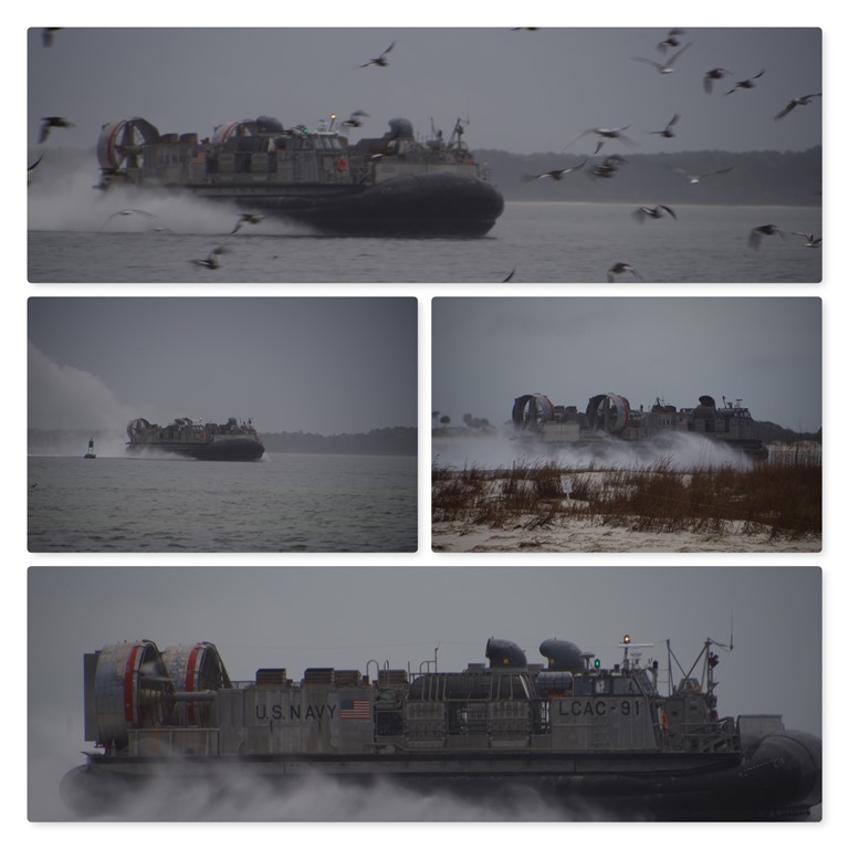 As we approached the channel to leave Big Lagoon Bay we could hear this Military (Navy) hovercraft come barreling across the bay. Then before we knew it, it was in front of us. So cool looking. Later while we were in the Gulf we could hear this before we could even see it. it passed us several times, a few miles away.