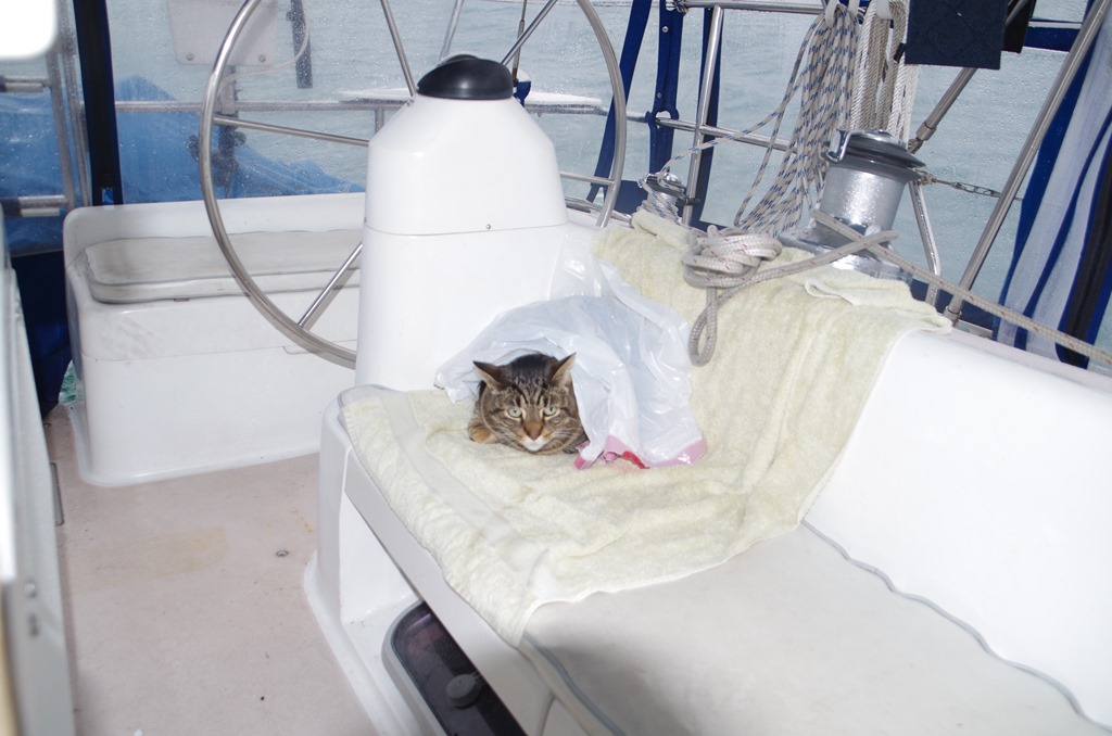 I really need to spary some water proofing on our bimini. Poor George needed his rain coat (garbage bag) over him. He was not amused..