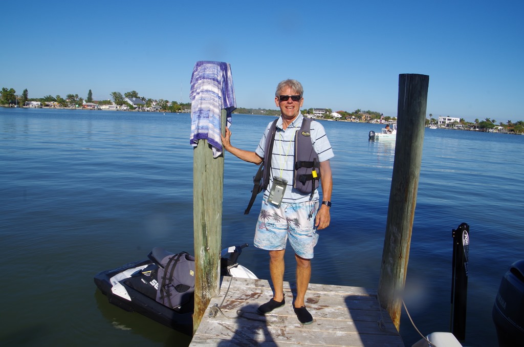 Bryce getting off the jet ski onto the dock at Sea Breeze restaurant.