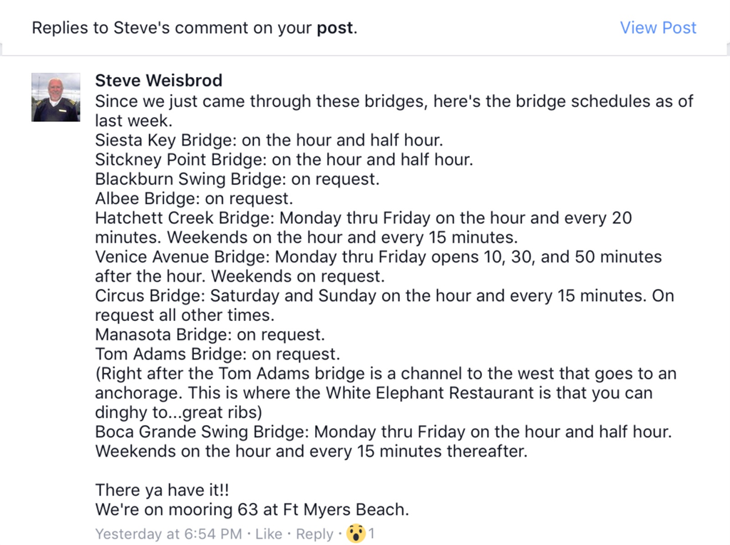 Good Bless great Friends. Last night I received a comment on Facebook from a friends of ours. Steve and Judy sent us a list of all the bridges that we would be waiting on to open. Thanks our friends see you in a few days. For those that don’t know, the bridges are shown in Active Captain and listed in the Water way guide. They are timed quite well so there is rarely a wait. We contact the bridges on VHF 9 about 1 mile before the bridge to verify the opening time. Then we base our speed on the GPS time to get to the bridge when they open.