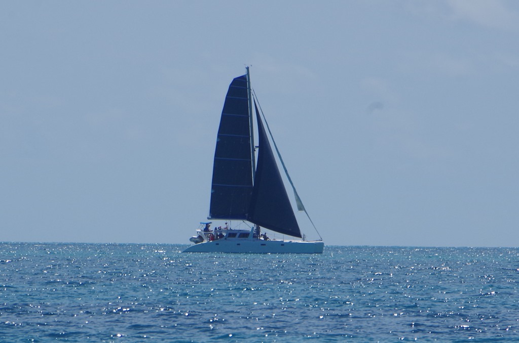Looking across the Atlantic I watch boats drift south. The sunshine highlighting the boats. Here is pretty view of a catamaran headed south in the keys.