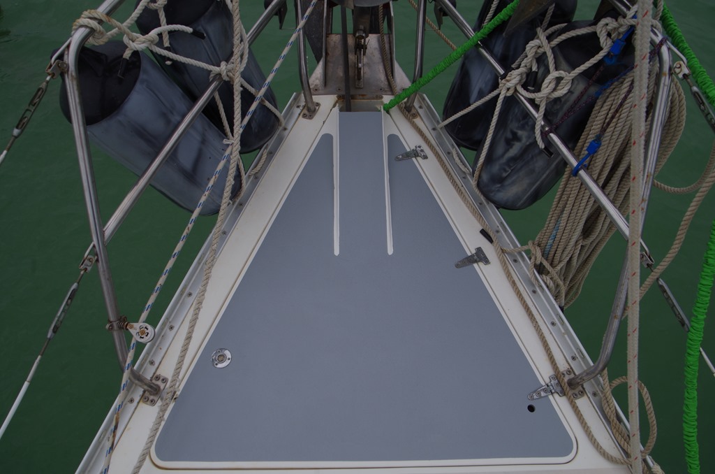 The taping takes such a long time. He started with the anchor hatch. We had heard that the paint would be runny; but it was a bit thick.