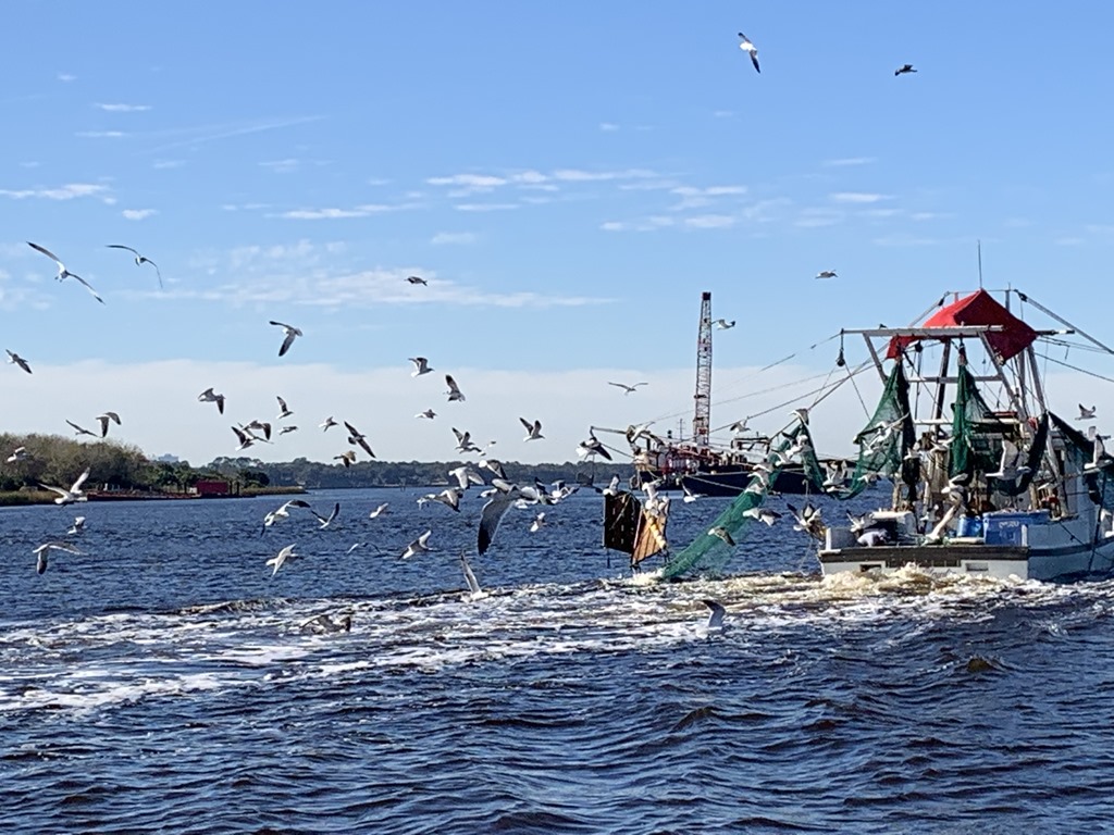 I like watching the birds flying around the fishing boats looking for food.