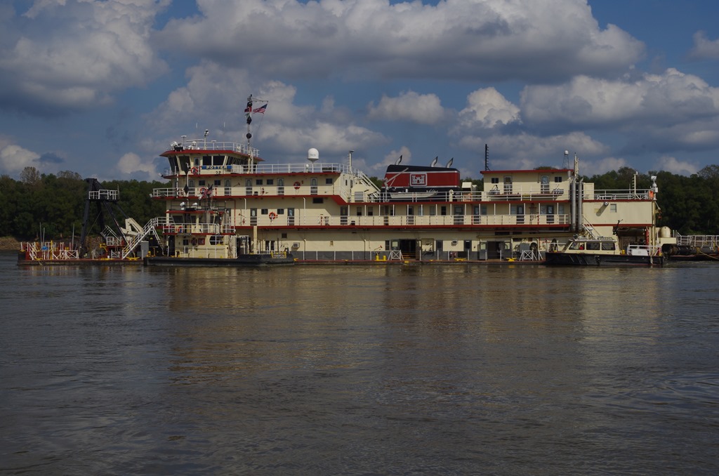 Look how long this tow is. Her name is Angela K. She was pushing 4 wide and 7 long barges. Total 28 barges. The longest we saw today was 8 barges long by 4 wide. This would be about 1700 feet long. Do you know how much cargo is moved on the Mississippi? 620 million tons moved on the inland waterways system in 1995, 321 million tons moved on the Mississippi River. The Ohio River tonnage 236 million while the Gulf Intracoastal Waterway saw 119 million ton.