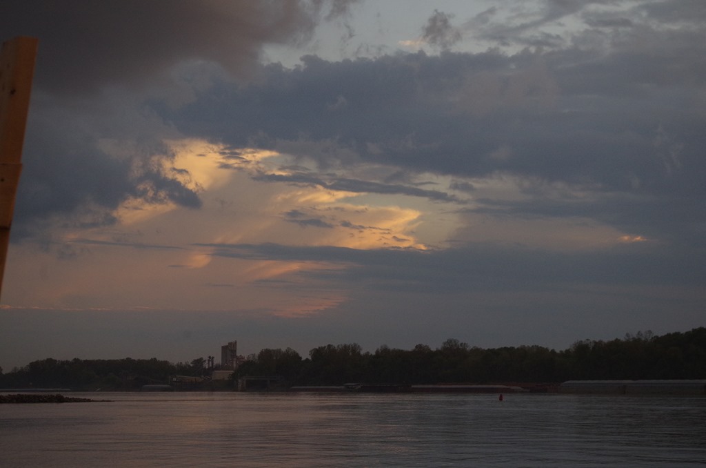 This is the nice sandy Kentucky shoreline. These sandy beaches are one of the things we love about the river. We are anchored at Mile Marker 890 just across from the New Madrid. We are on the inside curve of the river, inside the red buoys. An inside curve of the river is our favorite place to anchor as it is most often a sandy shore with little current. In spite of the current being 3-5 mph in the center of the river, on the inside curves the current drops to 0.5 mph. The water temp is cooling down at 64.9 degrees. Brrrr You really can’t see it too well, but there is a tiny fishing boat with a tent up on the beach. Sure hope they stayed warm last night.
