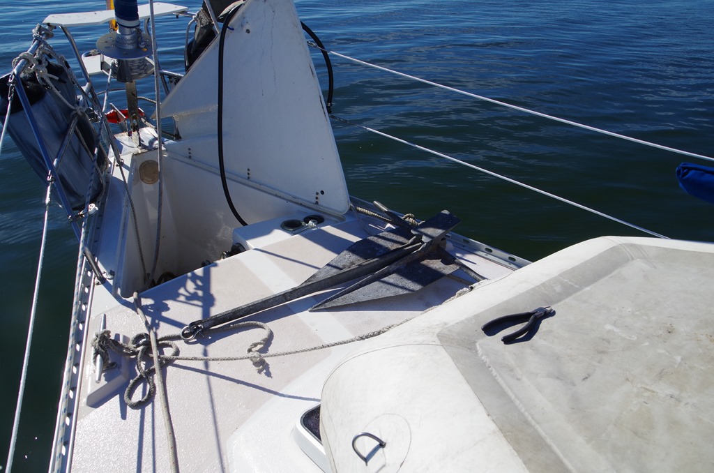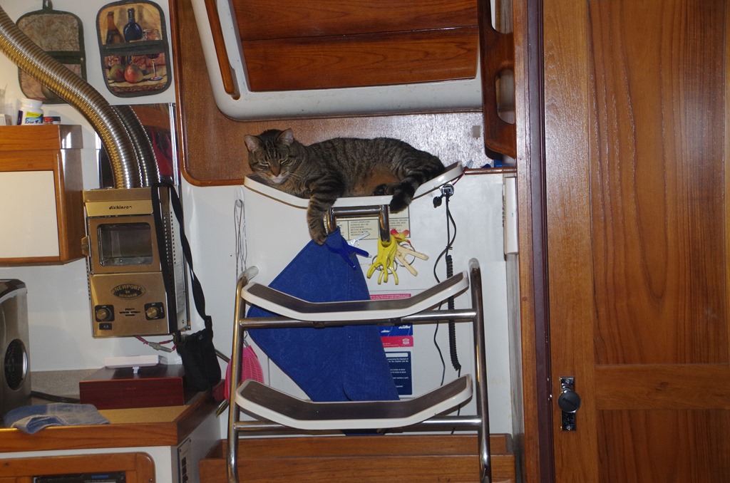 Back on the bow.. only a bit cool.. I had hats and jackets made with our blog & boat name.