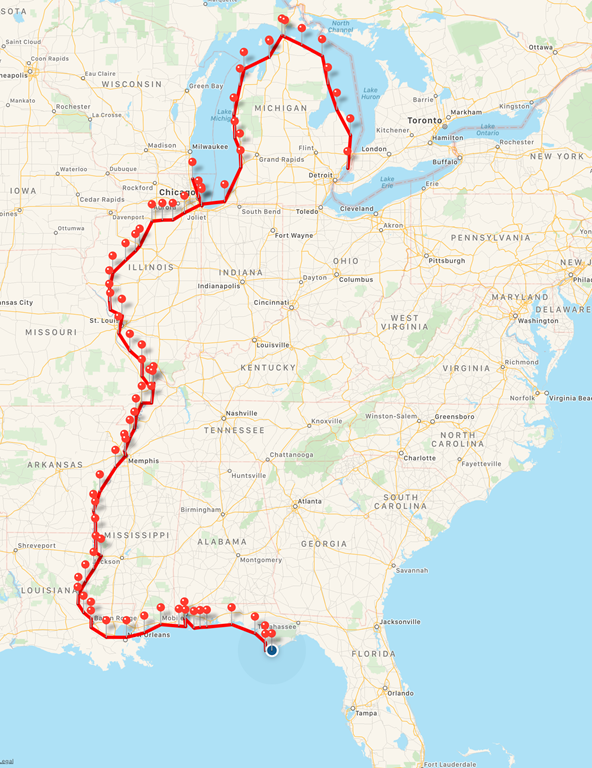 Wow…We been traveling 5 months, 2 weeks.  For 2 months and 7 days we spent waiting on an engine in Mobile. Each one of these red dots represent a stop. There are 77 dots. https://trackmytour.com/35L17
